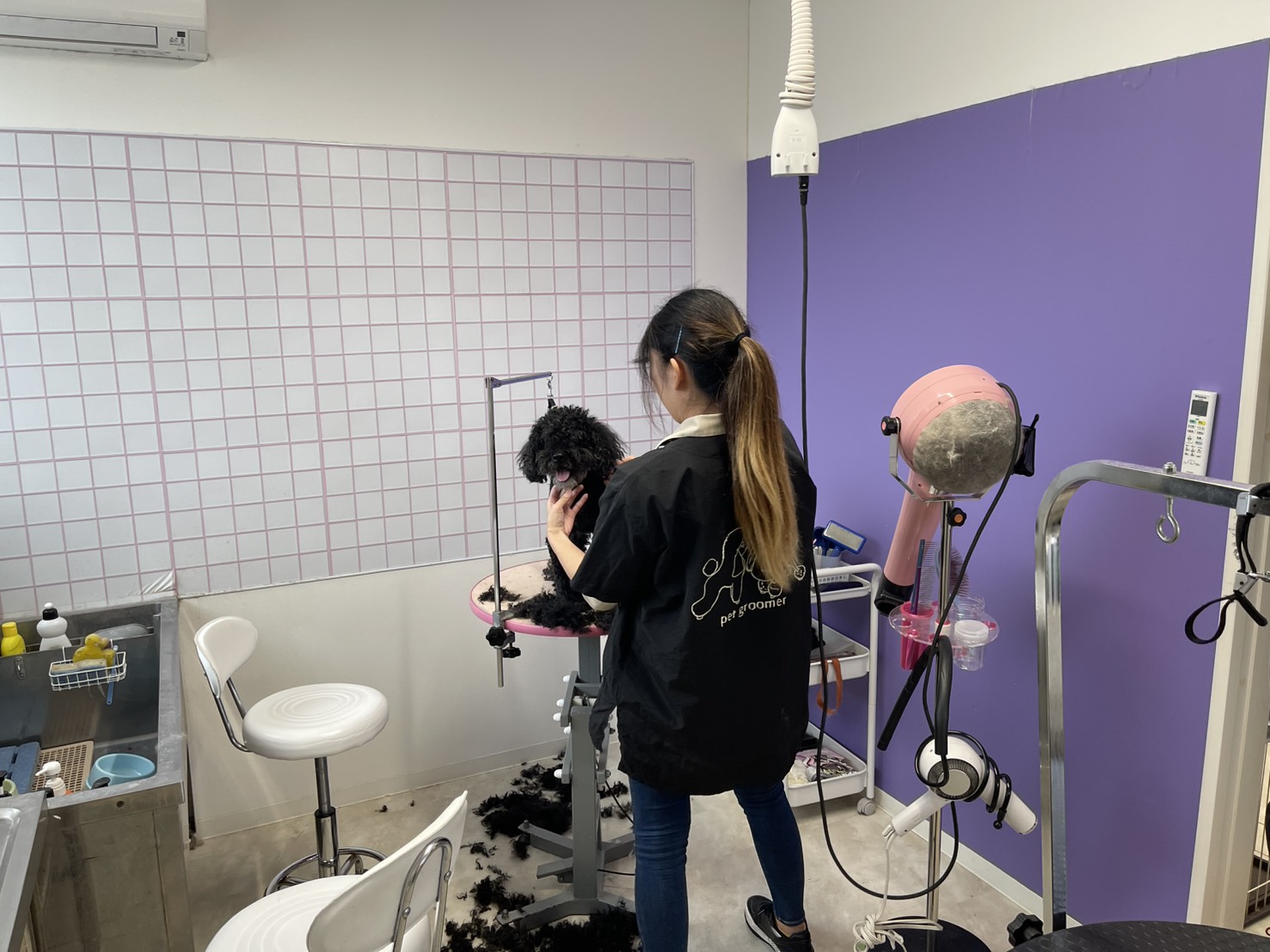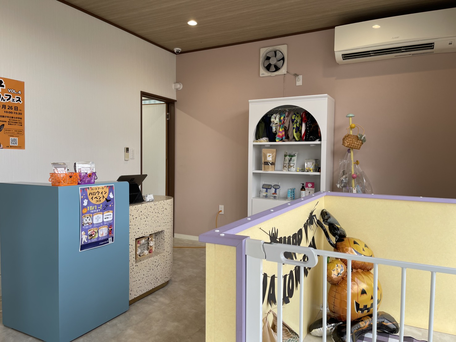 清潔感のあるポップな色使いの店内(私も常々トリミングサロンはポップな色調の店舗が良いと思ってます)